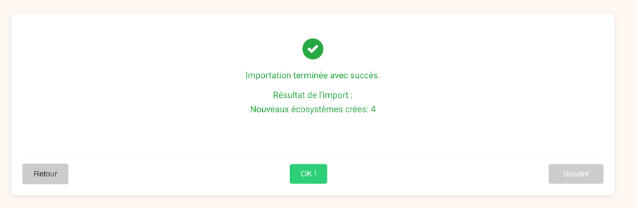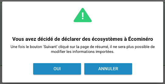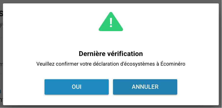 Cliquez sur "oui" si vous souhaitez envoyer votre déclaration d'écosystèmes à Ecominéro (action irréversible) :