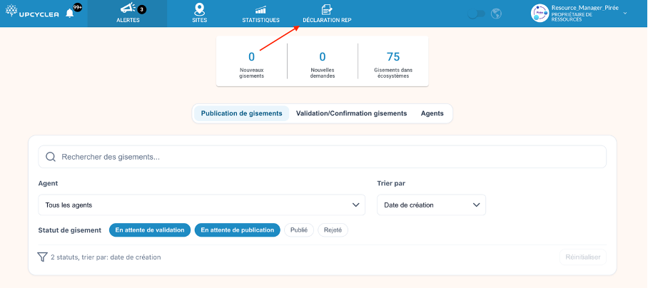Une fois connecté(e), depuis votre rôle "Propriétaire de ressources", accédez à la fonctionnalité de déclaration en cliquant sur « Déclaration REP ».