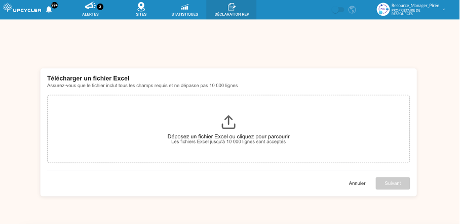 Si vous n'êtes abonné à aucune des plateformes, vous pouvez obtenir un accès gratuit à PIRÉE pour faire vos déclarations REP en nous contactant ici (et en indiquant "Faire une déclaration REP PMCB sur PIRÉE") ou en faisant votre demande à support@upcyclea.com. Vous disposerez alors d'un compte comprenant le rôle "Propriétaire de Ressources" pour accéder à la fonction "Déclaration REP" et d'un rôle "Responsable Besoins" pour consulter la mine urbaine.