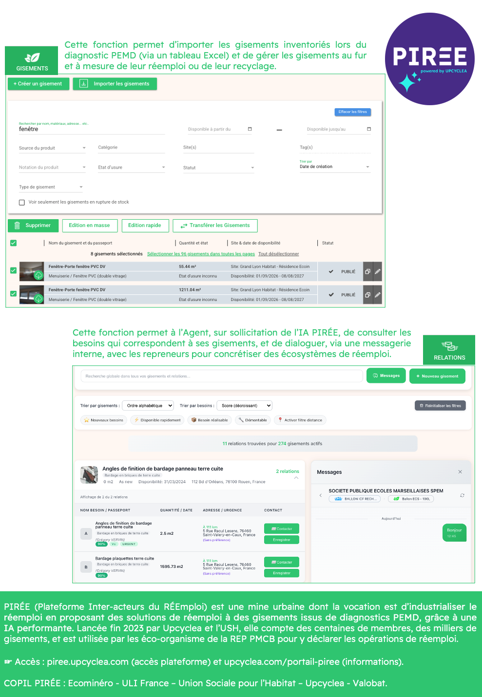 1. Plateforme PIRÉE1 (Plateforme Inter-acteurs du RÉEmploi) : Mine urbaine partagée entre bailleurs publics et privés, lancée par Upcyclea, l’USH, ULI France et l’ADI, et qui permet de partager les inventaires issus des diagnostics PEMD ou ressources des acteurs abonnés, de déclarer des besoins en réemploi ou en upcyclage, et de disposer d’un Resource manager commun qui propose des écosystèmes de réemploi/upcyclage.