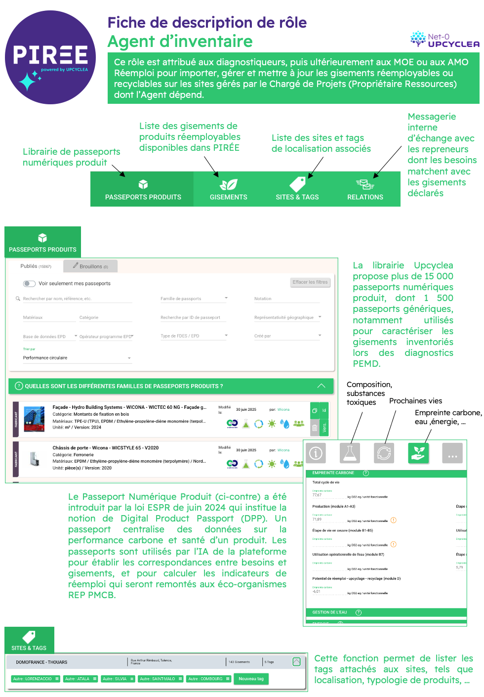 1. Agent : rôle Upcyclea permettant de créer, importer et gérer les gisements de produits qui sont issus d'un diagnostic PEMD (scénario sortant de déconstruction) ou qui constituent un bâtiment (scénario entrant de construction/rénovation), et d'échanger avec un Responsable Besoins sur des correspondances Gisements x Besoins proposées par l'IA.