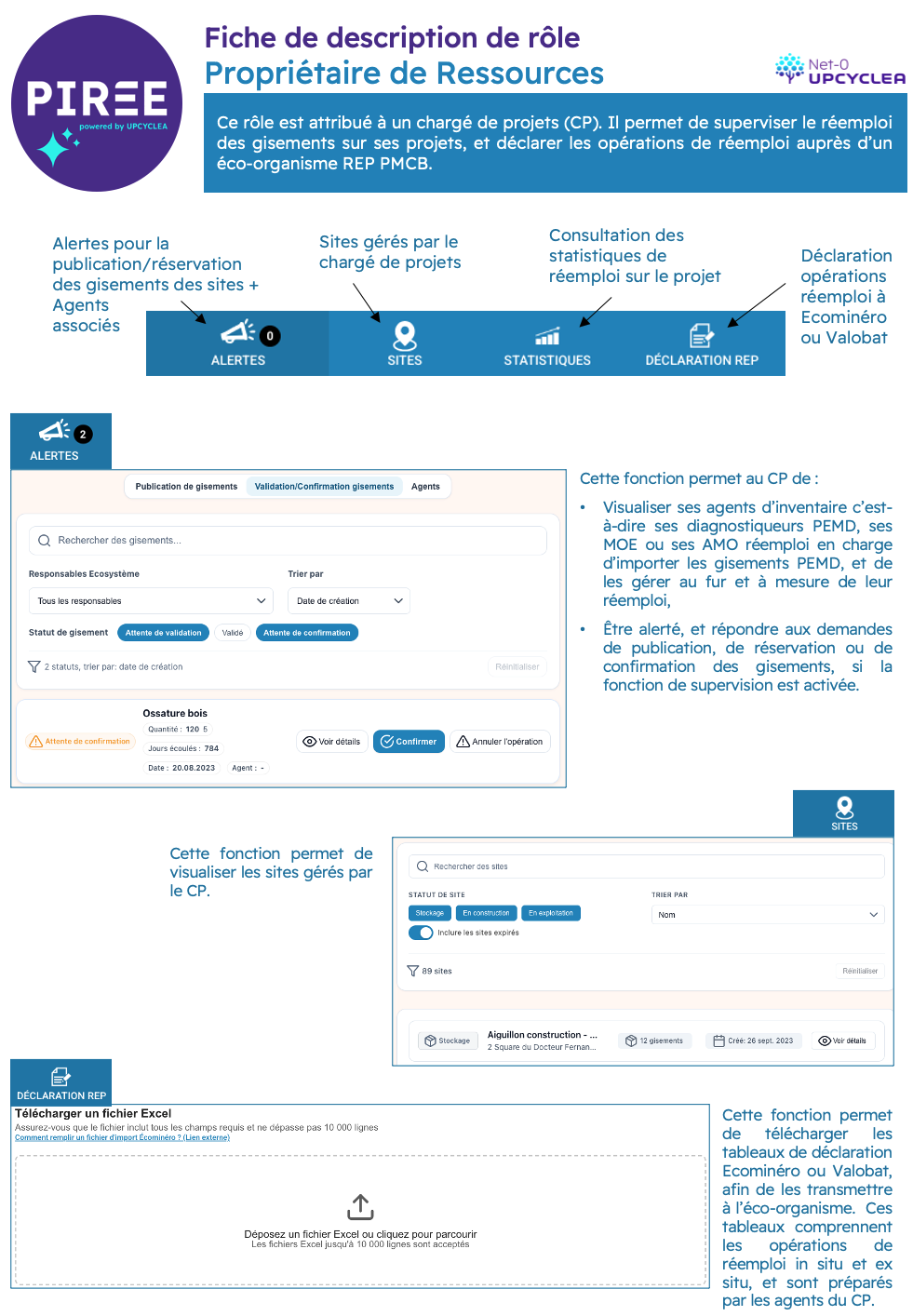 - Propriétaire Ressources : rôle Upcyclea permettant de superviser les gisements d'un bâtiment, ainsi que les statistiques associées (correspondances proposées par l'IA avec des besoins, contacts entre offreurs et demandeurs, écosystèmes de réemploi/upcyclage/recyclage relatifs aux gisements concernés).