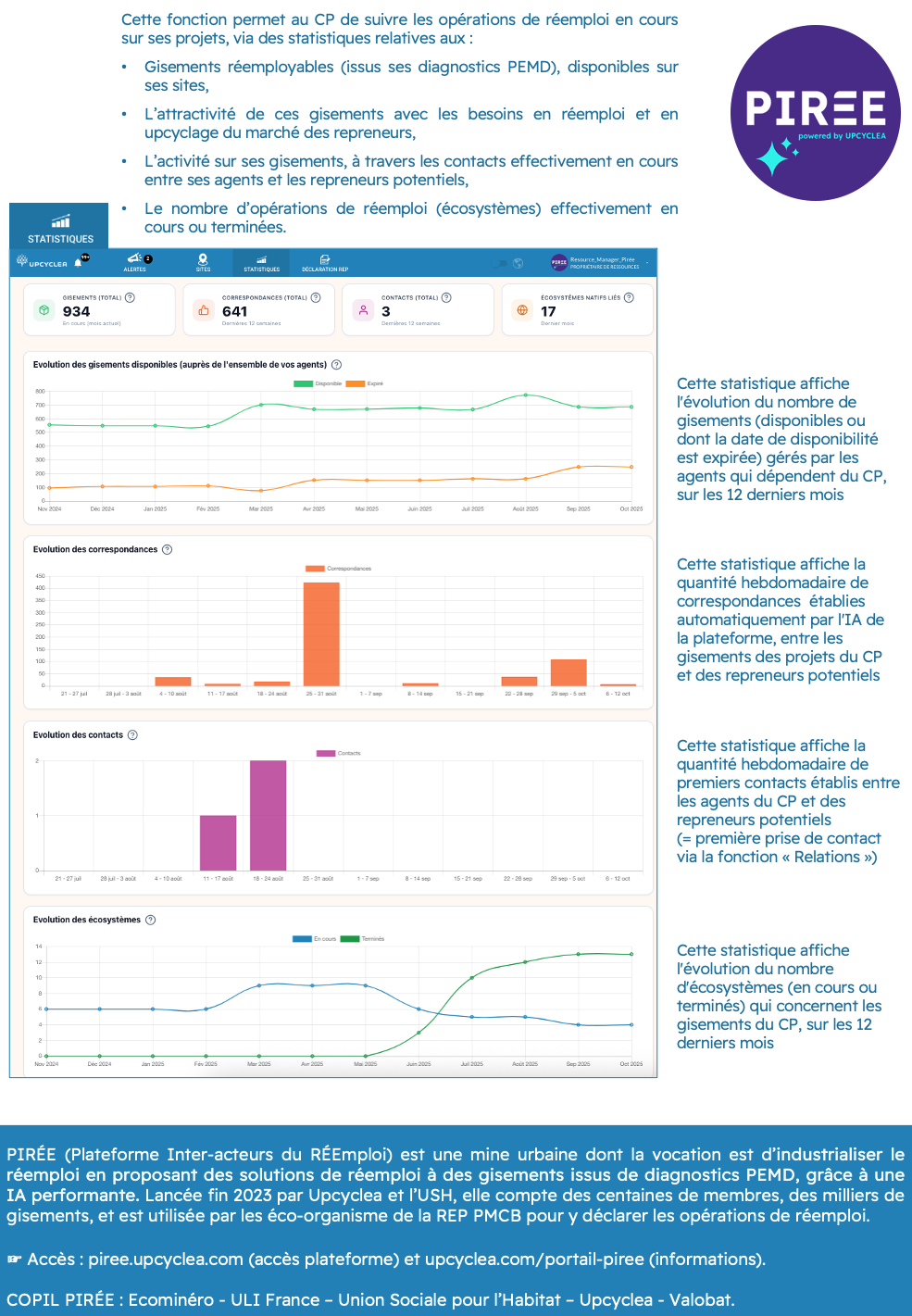 - Plateforme PIRÉE1 (Plateforme Inter-acteurs du RÉEmploi) : Mine urbaine partagée entre bailleurs publics et privés, lancée par Upcyclea, l’USH, ULI France et l’ADI, et qui permet de partager les inventaires issus des diagnostics PEMD ou ressources des acteurs abonnés, de déclarer des besoins en réemploi ou en upcyclage, et de disposer d’un Resource manager commun qui propose des écosystèmes de réemploi/upcyclage.