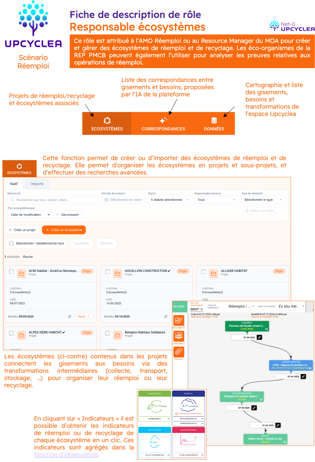 - Propriétaire Ressources : rôle Upcyclea permettant de superviser les gisements d'un bâtiment, ainsi que les statistiques associées (correspondances proposées par l'IA avec des besoins, contacts entre offreurs et demandeurs, écosystèmes de réemploi/upcyclage/recyclage relatifs aux gisements concernés).