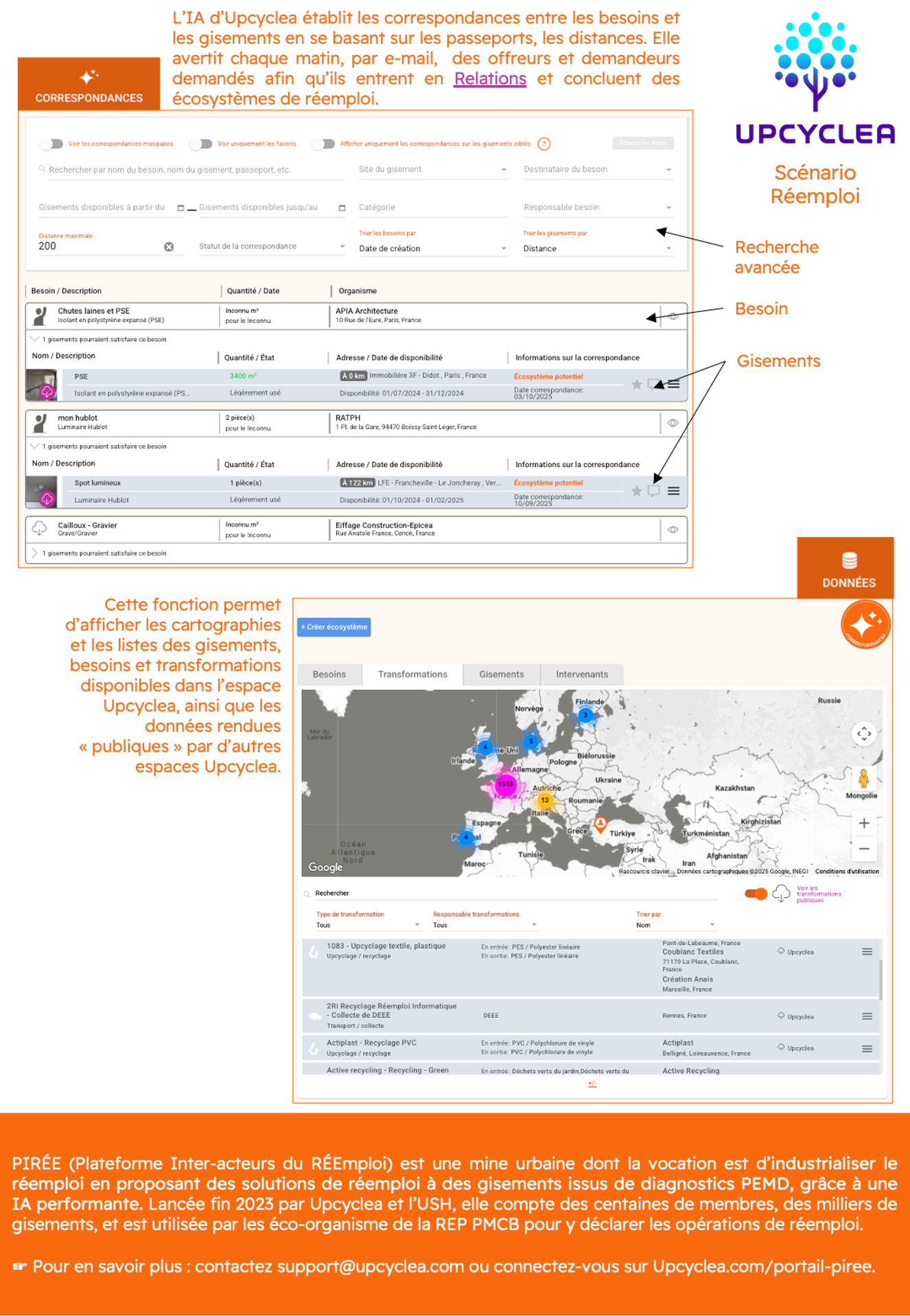 - Plateforme PIRÉE1 (Plateforme Inter-acteurs du RÉEmploi) : Mine urbaine partagée entre bailleurs publics et privés, lancée par Upcyclea, l’USH, ULI France et l’ADI, et qui permet de partager les inventaires issus des diagnostics PEMD ou ressources des acteurs abonnés, de déclarer des besoins en réemploi ou en upcyclage, et de disposer d’un Resource manager commun qui propose des écosystèmes de réemploi/upcyclage.