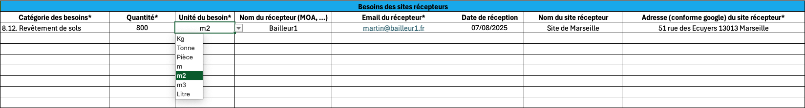 Le tableau d'import des opérations de valorisation (disponible en pièce jointe) permet d'importer en masse, dans la plateforme Upcyclea, les opérations de réemploi, d'upcyclage ou de recyclage d'un maitre d'ouvrage.