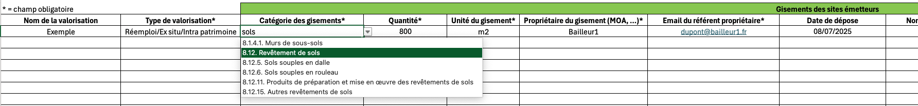 Il est important de renseigner la catégorie la plus précise possible, avec la bonne unité associée à la quantité, car lors de l'import la plateforme associera automatiquement un Passeport Numérique Produit à chaque gisement, ce qui permettra de calculer les indicateurs ESG sortants.