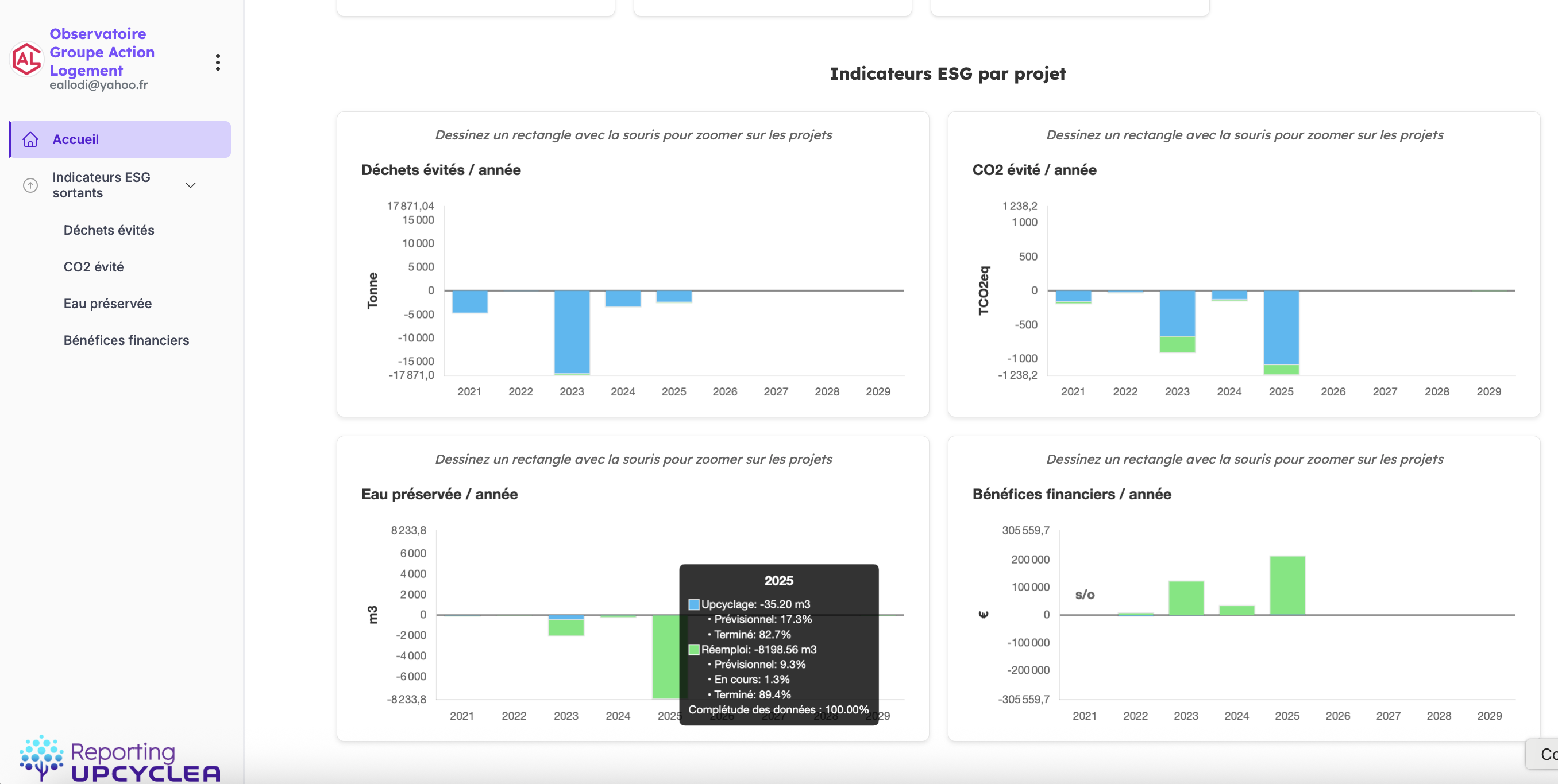 Les indicateurs sont ensuite visualisables dans Upcyclea-Reporting (en mode Observateur), par année et par import.