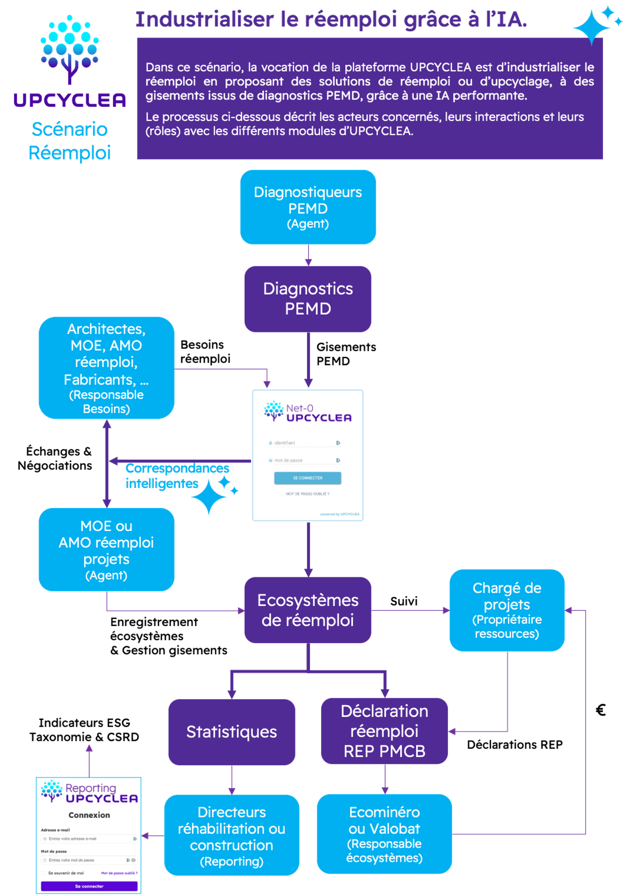 - Propriétaire Ressources : rôle Upcyclea permettant de superviser les gisements d'un bâtiment, ainsi que les statistiques associées (correspondances proposées par l'IA avec des besoins, contacts entre offreurs et demandeurs, écosystèmes de réemploi/upcyclage/recyclage relatifs aux gisements concernés).